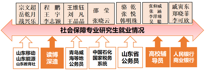 本专业毕业生掌握现代管理理论、技术与方法,熟悉我国社会保障方针、政策及法律法规,掌握扎实的社会保障基础理论与专业知识,实践能力突出、专业技能过硬。可胜任人力资源和社会保障、民政、医疗保障、税务和工会等政府部门社会团体以及大中型企业相关工作。近年来,毕业生就业去向包括国家税务总局临沂经济技术开发区税务局、中国石化集团共享服务有限公司东营分公司、中国移动通信集团山东有限公司济南分公司、山东能源集团等政府部门、企事业单位,部分毕业生继续深造于中国人民大学、武汉大学、中南大学、山东大学、中国社会科学院大学等知名高校。