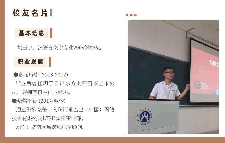 刘玉宁,2009级汉语言文学专业校友。2013年毕业后,他的职业道路展现了多元与开拓的特质,先后在日出东方太阳雨集团等上市公司任职,并积累了自主创业的宝贵经验。2017年,他凭借扎实的综合能力通过激烈竞争,成功入职阿里巴巴(中国)网络技术有限公司,现任ICBU国际事业部济南区域跨境电商顾问。他将人文专业素养与商业实践相结合,成功在跨境电商领域开拓了事业新版图,是文科学子跨界发展的杰出代表。