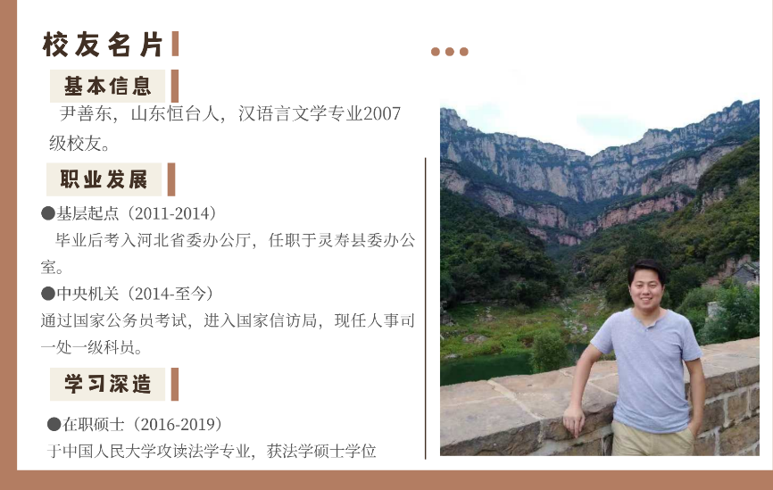 尹善东,2007级汉语言文学专业校友。2011年毕业后,他通过公务员考试进入河北省委办公厅系统,在石家庄市灵寿县委办公室开启了职业生涯,积累了宝贵的基层工作经验。2014年,他通过国家公务员考试,进入国家信访局工作,展现了出色的业务能力,现任国家信访局人事司人事一处一级主任科员。为不断提升自我,他在工作期间于2016年考入中国人民大学在职攻读法学专业,并于2019年获得法学硕士学位,其在发展上表现出稳健扎实、厚积薄发的特点。