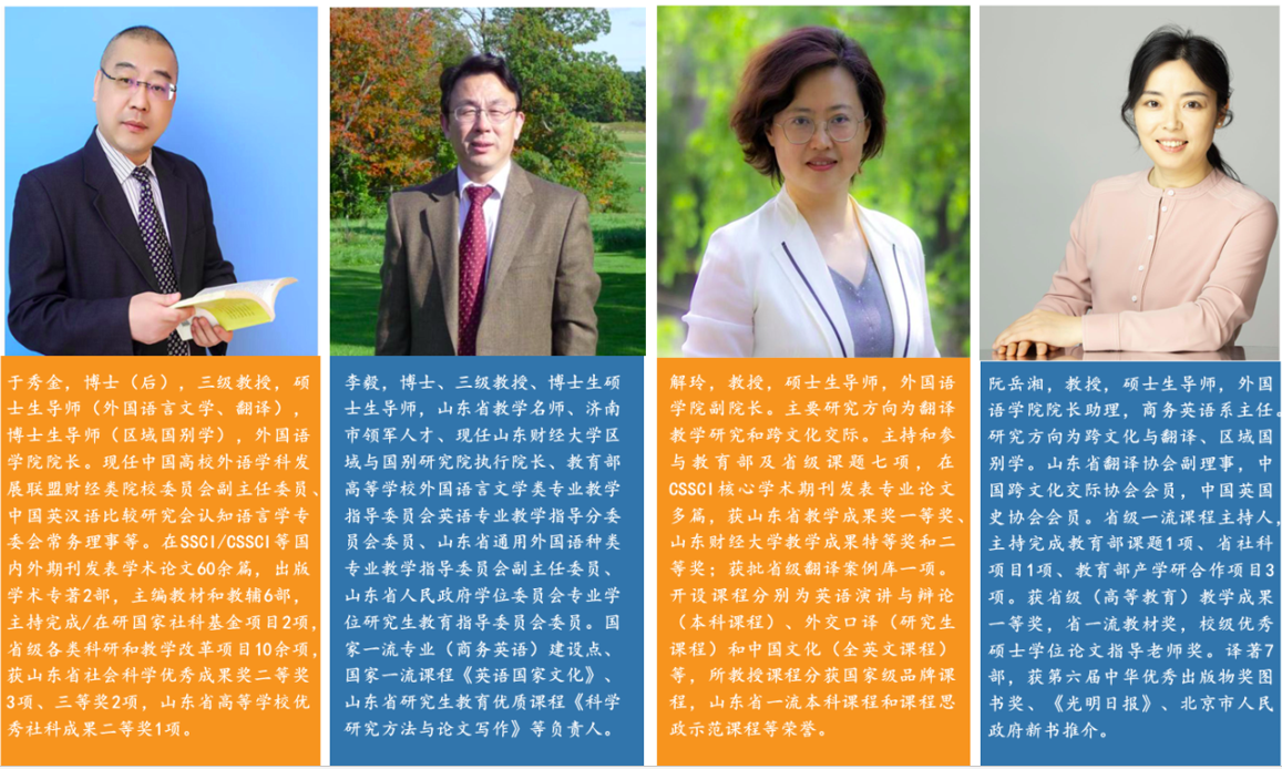 拥有丰富翻译理论与实践经验的校内专任硕士生导师27人,校外导师9人。其中校内导师正高级职称15人,副高级职称12人,具有高级职称教师占总人数的100%;全部具有硕士以上学位,其中博士21人,占比78%;有境外学习、进修经历的24人,占比89%。现有现有山东省教学名师1人、山东省优秀研究生指导教师1人、山东省思政优秀教学团队1个、山东财经大学教学名师1人、山东财经大学优秀教师7人、山东财经大学师德师风先进个人1人。