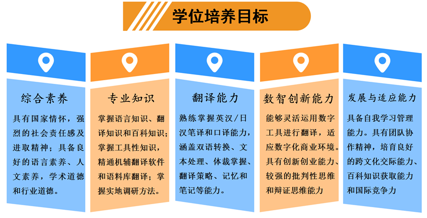 面对智能化机器翻译的挑战与“一带一路”倡议下翻译人才需求的重大机遇,本学位点遵循“翻译+”创新改革理念,致力于研究生知识、素养、能力三方面的培养,最终实现培养卓越“翻译+”人才的目标:培养“翻译+专业”的跨领域复合型人才和“翻译+本地化服务”的语言服务人才。